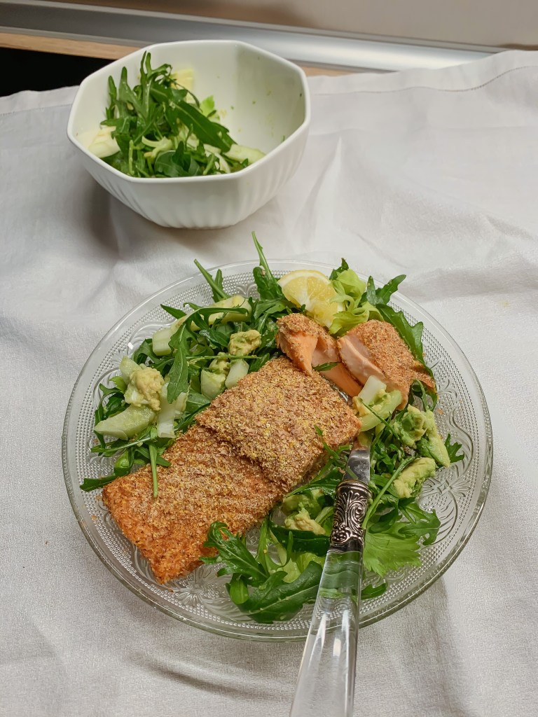 Per preparare il vostro salmone croccante gluten free, basta partire dalla panatura. Miscelata la crusca e la farina di polenta con la curcuma e il sale iodato (senza farvi prendere la mano, ne basta un pizzico). Panate per bene il salmone, dopo averlo bagnato e assicuratevi che sia ben ricoperto. Adesso è pronto per esser cotto, o in padella con un filo di olio EVO o in forno ventilato per 15 minuti a 180 gradi (usate una buona carta forno, io prendo sempre @cuki_officialpage in fogli).