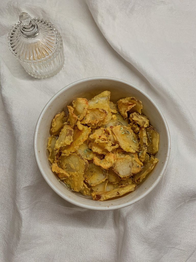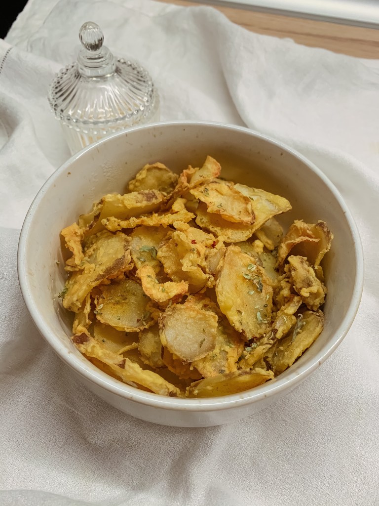 Per un pasto funzionale, sano, sfizioso e anche divertente da preparare, vi propongo le mie chips di topinambur panate con farina di ceci, fritte in olio d’oliva e condito con tanti aromi.