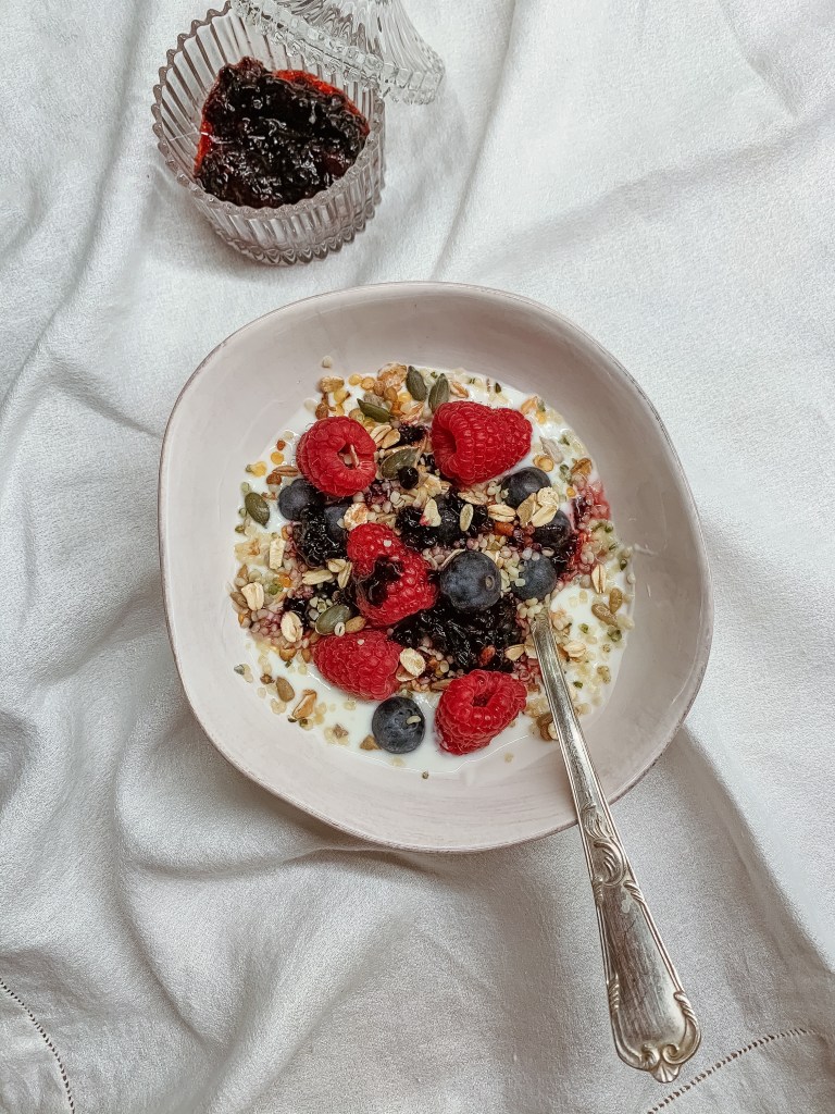 Ho utilizzato prodotti genuini, alla portata di tutti e facili da trovare. Cosa serve ? Un vasetto di yogurt intero in vetro di qualità, cremoso e denso, poco acido, come il mio Vipiteno in vetro o uno skyr ricco di proteine (vedi articolo sugli yogurt consigliati). Prodotti fermentati come il kefir, contenenti probiotici fondamentali per la salute intestinale e non solo. Tanti frutti rossi freschi come more, mirtilli e lamponi (italiani) ricchi di composti antiossidanti. Semi oleosi (canapa/lino/girasole) proteici e contenenti acidi grassi insaturi (omega 3 e 6) e crusca d’avena o fiocchi integrali (ricca di beta glucani).