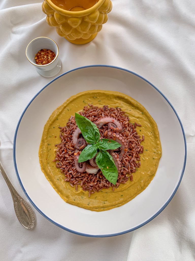 - Assembla gli ingredienti partendo dalla crema: adagiala sul piatto e unisci il riso con il polpo tagliato (entrambi conditi con olio)