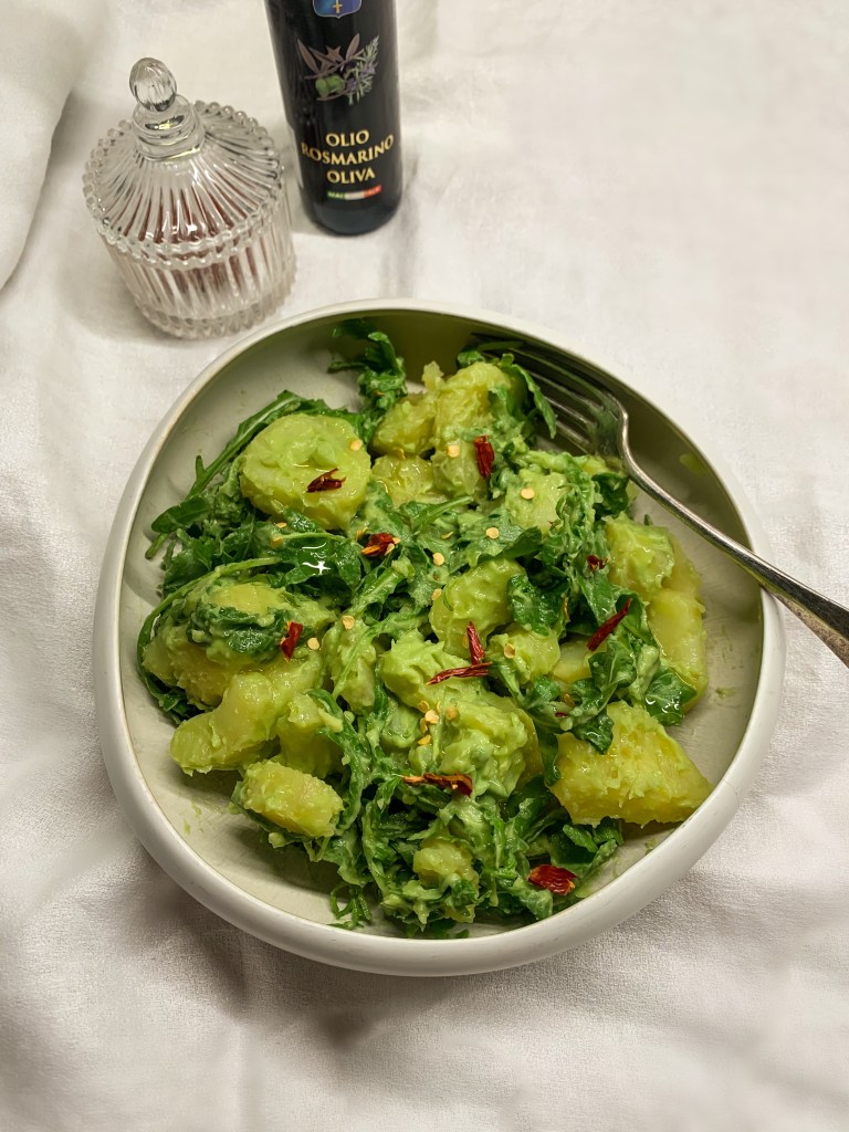 - Sbuccia, taglia e aggiungi la rucola, poi condisci con la crema di avocado, il basilico, peperoncino e olio evo.