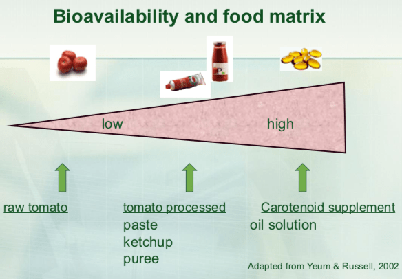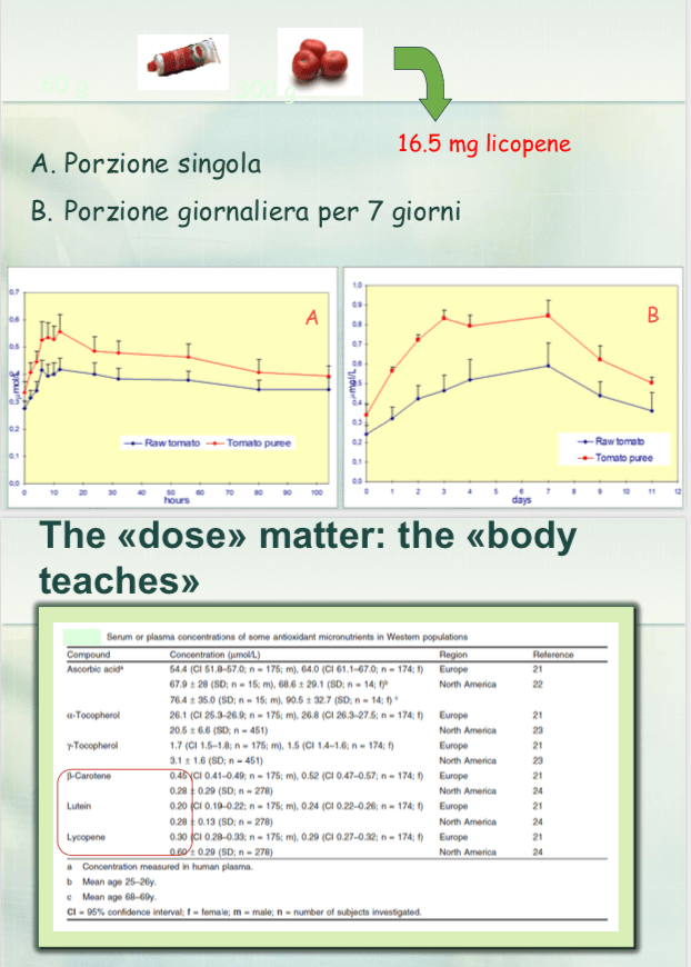 Il potenziale (sottoscrivo questa parola: p-o-t-e-n-z-i-a-l-e) effetto antiossidante del licopene si esplica solo se la molecola viene metabolizzata. Non è così semplice come sembra, perché la biodisponibilità di questi composti antiossidanti è decisamente limitata e complessa. Essa dipende da più fattori che riguardano sia l’individuo (assorbimento intestinale, trasporto, microbiota ecc.), sia l’alimento stesso (quantità di grasso presente, processo di trasformazione applicato alla matrice alimentare ecc.).
