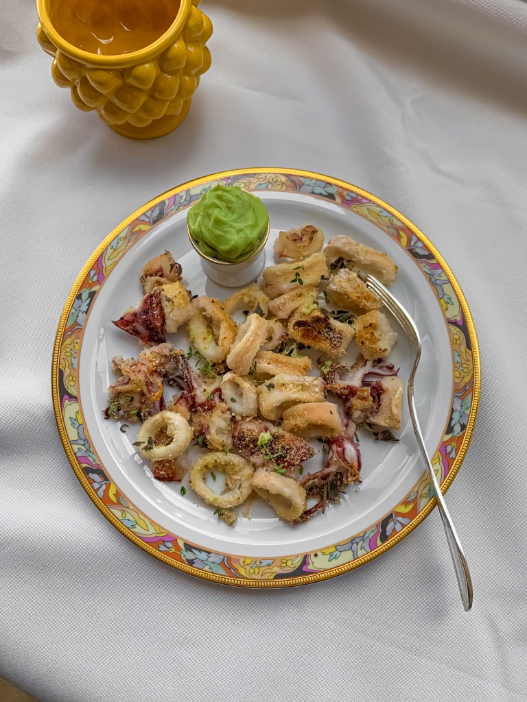 - Pulisci e taglia i calamari a rondelle.