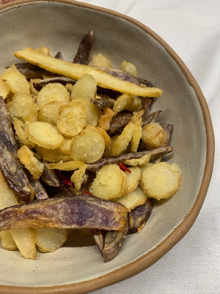 - Infarina in una ciotola le radici bagnate con la farina di riso finché non siano ben ricoperte e ben asciutte. Togli la farina in eccesso prima di friggerle
